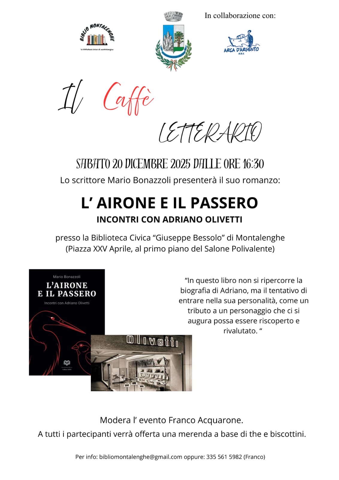 Nel terzo incontro della nuova edizione de "Il Caffè letterario" della biblioteca civica G. Bessolo di Montalenghe Mario Bonazzoli presenterà il proprio libro "L'airone e il passero. Incontri con Adriano Olivetti.